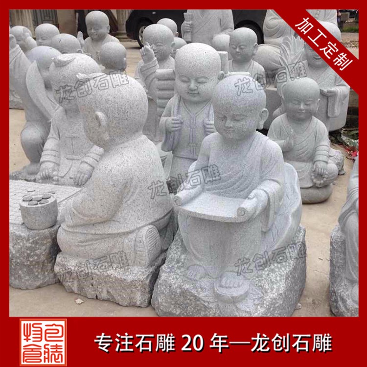 石雕小和尚就是用石頭雕刻制作的小和尚造型,一般都是7歲以上,20歲以下的孩童雕塑。由于小孩的天真爛漫,各種各樣有趣的造型都會做出來,比如下棋的小沙彌,睡姿的小沙彌、嬉戲的以及功夫小沙彌,打掃衛生的等等,也有一些修行的小沙彌造型,比如參禪打坐的造型,敲木魚的造型。石雕小和尚的百態千姿是寺廟諸佛菩薩雕塑里面較多的一種,也是讓信眾們發自內心的喜愛和尊敬的一種佛教弟子塑像。