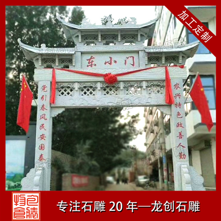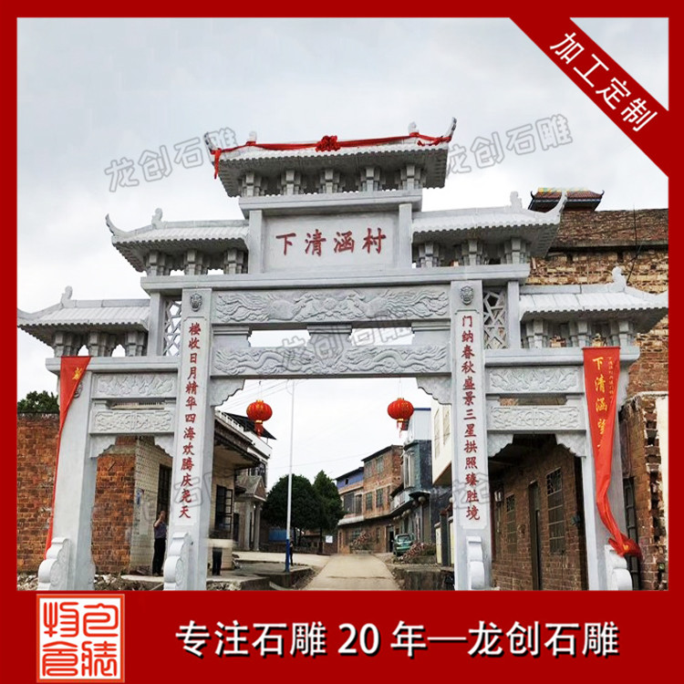 從村莊石雕牌坊圖片了解到村莊石牌坊的結(jié)構(gòu)大多采用三門樣式,當(dāng)然因安裝地理位置和環(huán)境的影響,也可采用一門樣式,如一門三樓和簡易單門沖天式樣式,不同規(guī)模的村莊可安裝不同的石雕牌坊樣式,需因地適宜的來建造。